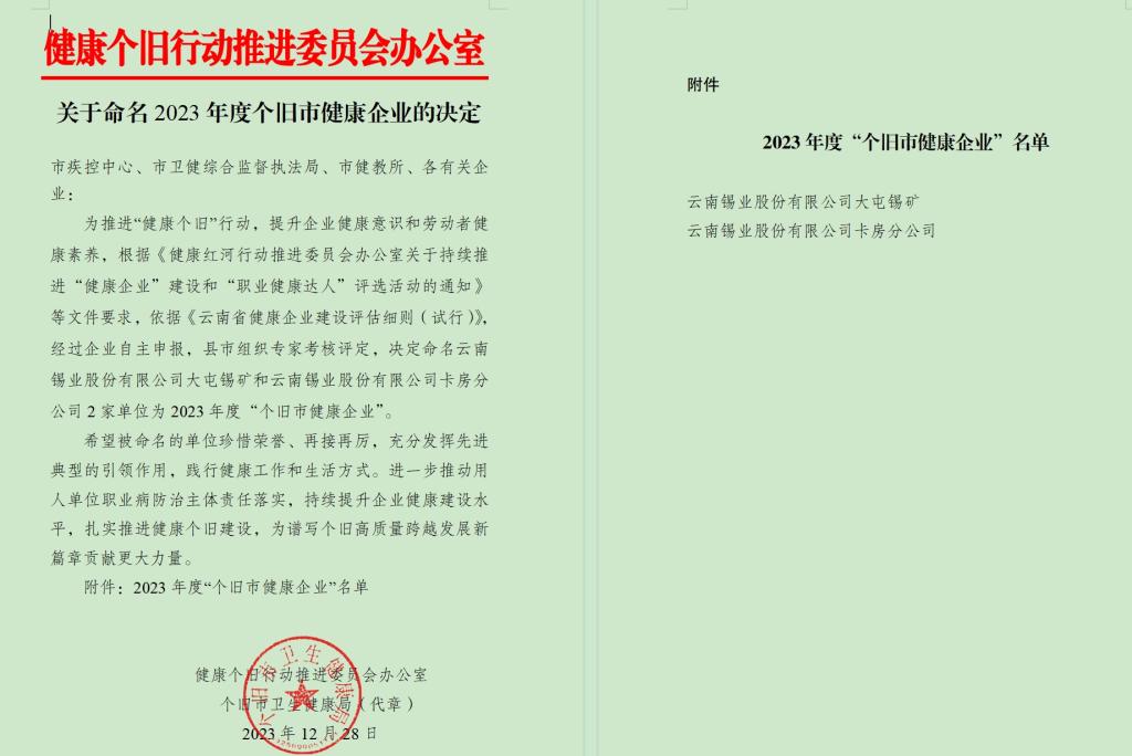 近日,2023年度“個舊市健康企業(yè)”名單揭曉,此次評選個舊市全市僅有云錫大屯錫礦、卡房分公司2家單位榮獲此殊榮。
