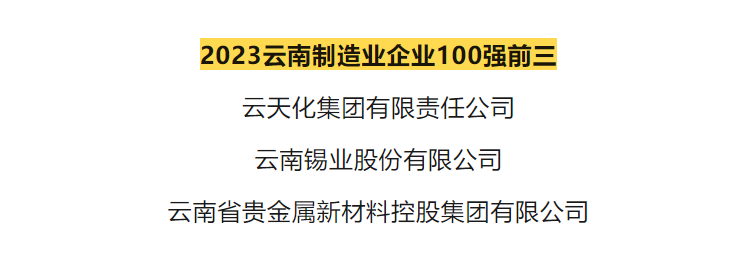 近日,由云南省企業(yè)聯(lián)合會、云南省企業(yè)家協(xié)會公開發(fā)布的“2023云南企業(yè)100強”新鮮出爐。錫業(yè)股份位列2023云南高新技術(shù)企業(yè)100強第1位,2023云南制造業(yè)企業(yè)100強第2位。