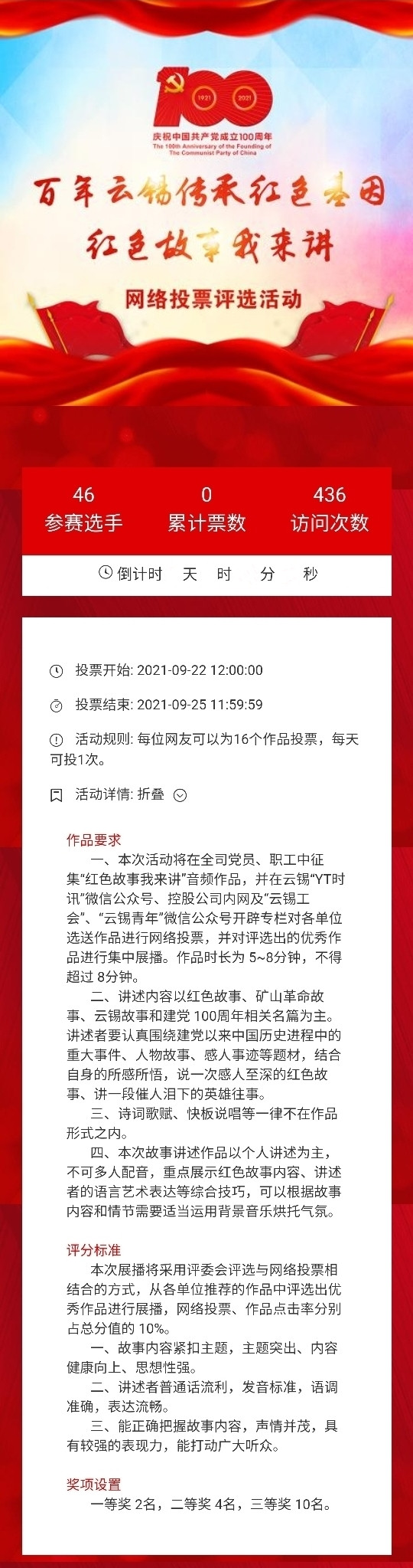 百年云錫傳承紅色基因——“紅色故事我來講”作品展播是云錫控股公司第32屆礦工節·文化月系列活動之一,經各單位精心組織,“紅色故事我來講”音頻作品征集工作現已完成,從9月22日12:00至9月25日12:00為網絡投票時間,敬請廣大干部職工積極參與并發動身邊的親友參與投票,一起選出心中的優秀作品。
