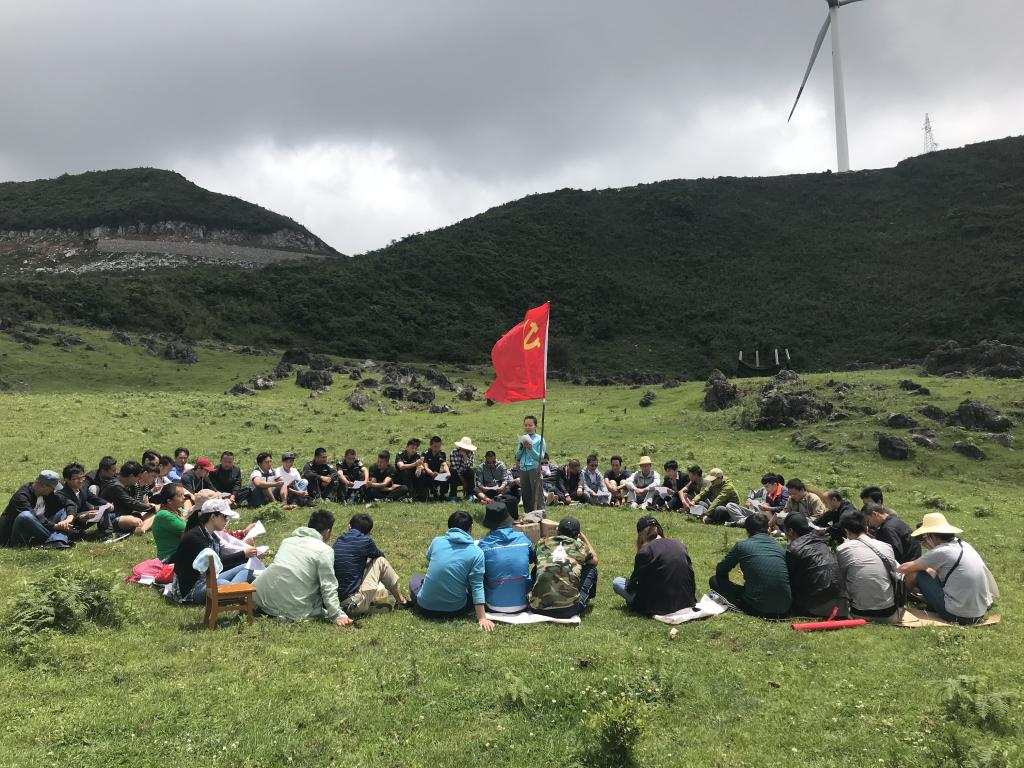 經(jīng)過3個(gè)多小時(shí)的路程,到達(dá)了目的地。延綿不斷的綠草地,抬手可觸的天空,不遠(yuǎn)處悠悠轉(zhuǎn)動(dòng)的風(fēng)力發(fā)電塔,讓黨員們異常興奮。有的大口呼吸著新鮮空氣,有的在綠地上隨意奔跑,有的登高望遠(yuǎn),有的不停擺造型自拍。一番開心后,藍(lán)天白云下,黨員們?cè)邗r紅的黨旗前重溫了入黨誓詞,并圍坐在黨旗周圍齊聲誦讀黨章、學(xué)習(xí)十九大知識(shí),歌唱“沒有共產(chǎn)黨就沒有新中國”“團(tuán)結(jié)就是力量”。隨后還開展了丟手絹、泡泡糖游戲,讓大家重拾童趣、歡聲笑語不斷。